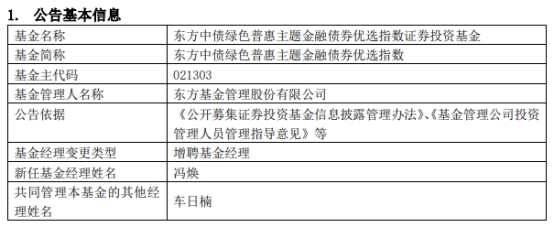 东方中债绿色普惠主题金融债券增聘基金经理冯焕