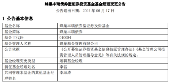 中国经济网北京6月17日讯 今日,蜂巢基金管理有限公司公告称,蜂巢丰瑞债券(A类010084;C类010085)增聘基金经理李磊。