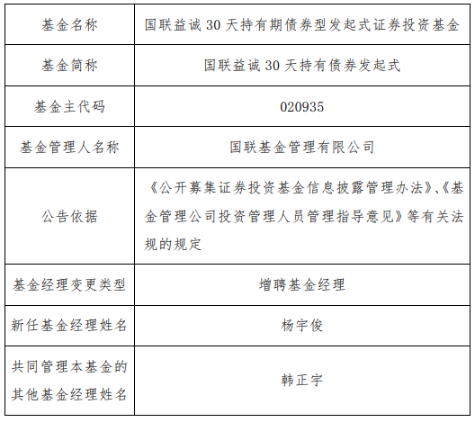 国联益诚30天持有债券发起式增聘基金经理杨宇俊