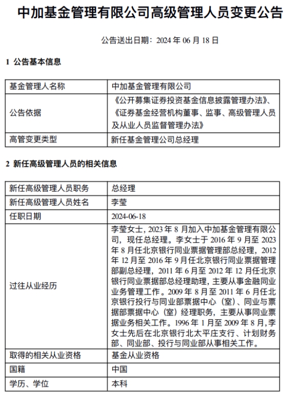 中国经济网北京6月18日讯 今日,中加基金管理有限公司发布高级管理人员变更公告。公告称,李莹任公司总经理。