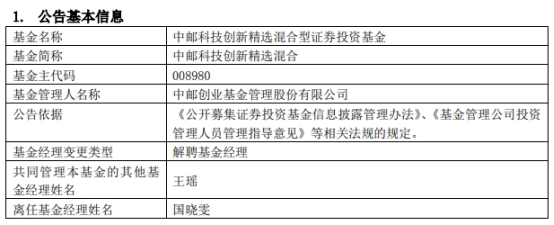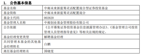 中邮基金国晓雯离任2只基金