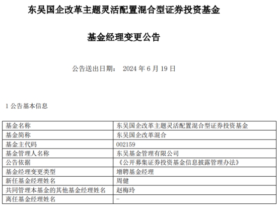 中国经济网北京6月19日讯 今日,东吴基金管理有限公司公告称,东吴国企改革混合(A类002159;C类012615)增聘基金经理周健。