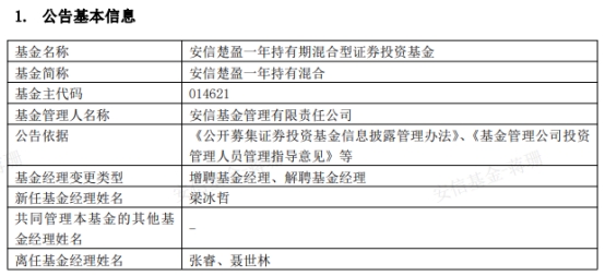 安信楚盈一年持有混合增聘梁冰哲 张睿与聂世林离任