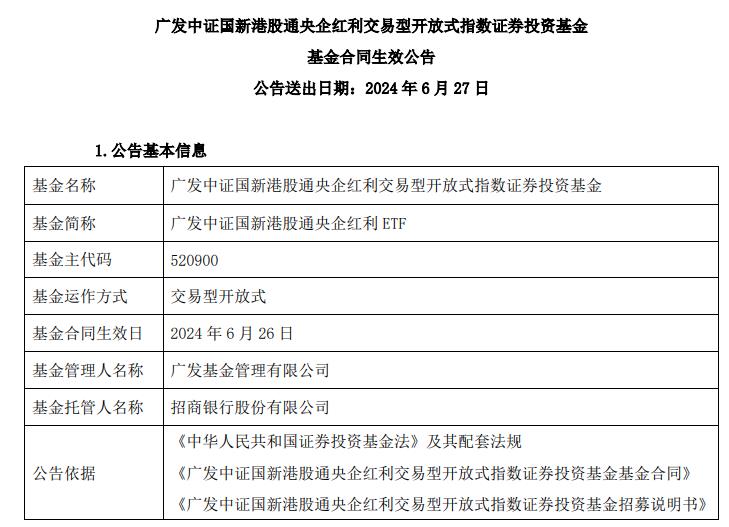 广发中证国新港股通央企红利ETF成立 规模11.65亿