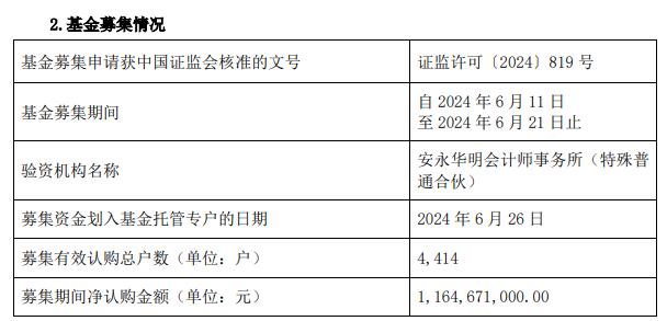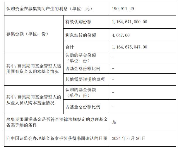该基金募集期间净认购金额1164671000.00元,认购资金在募集期间产生的利息190911.29元,募集份额合计1164675047.00份。