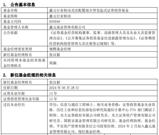 中国经济网北京6月28日讯 今日,鑫元基金管理有限公司公告称,鑫元行业轮动混合(A类005949;C类005950)增聘基金经理张汉毅。