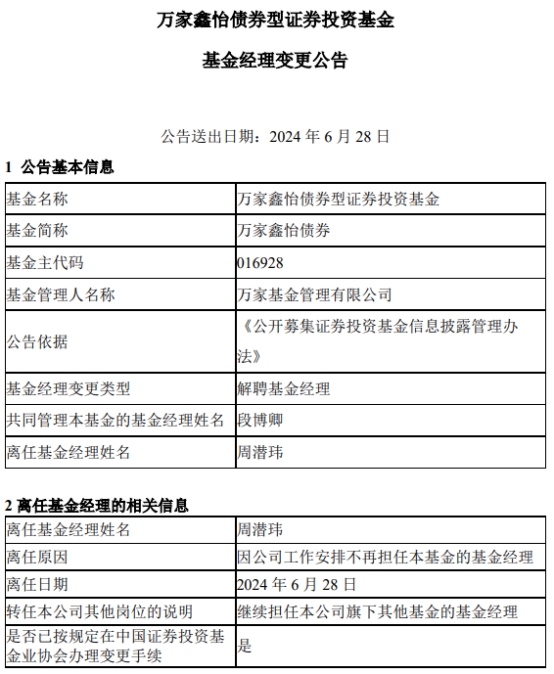 中国经济网北京6月28日讯 今日,万家基金管理有限公司公告称,周潜玮离任万家鑫怡债券(A类016928;C类016929)。