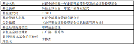兴证全球恒泰一年定开债增聘基金经理石广翔翟秀华