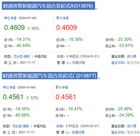 而截至昨日收盘,财通资管新能源汽车混合发起式A/C在今年内下跌分别达23.94%、24.08%。资料显示,该基金成立于2021年11月17日,其成立以来的累计收益率为-53.91%、-54.39%,累计净值0.4609元、0.4561元。