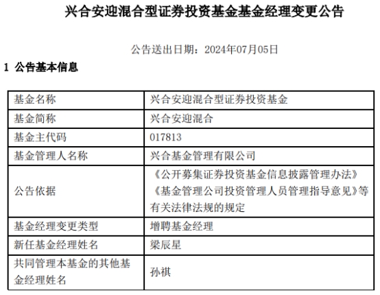 中国经济网北京7月5日讯 今日,兴合基金管理有限公司公告称,兴合安迎混合(A类017813;C类017814)增聘基金经理梁辰星。