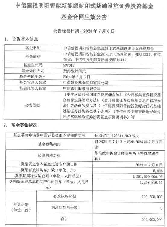中信建投明阳智能新能源REIT成立 基金规模12.8亿元