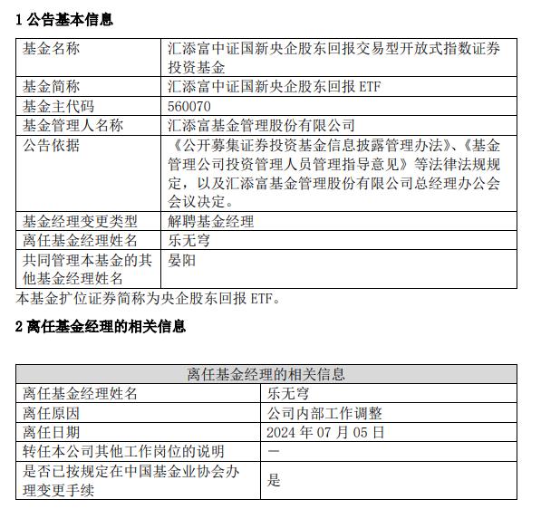 中国经济网北京7月8日讯 汇添富基金管理股份有限公司7月6日公告称,因公司内部工作调整,基金经理乐无穹离任汇添富中证国新央企股东回报ETF。