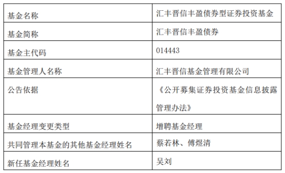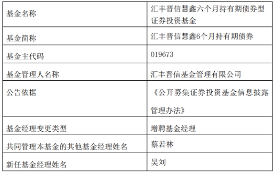 汇丰晋信基金2只债基增聘基金经理吴刘