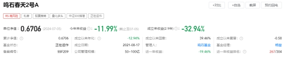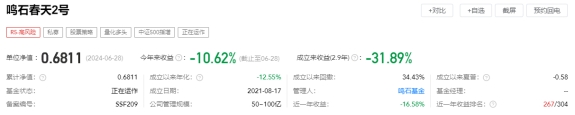 根据记者查询,鸣石春天2号成立于2021年8月17日,截至2024年6月28日,该基金今年来收益率为-10.62%,成立来收益率为-31.89%,累计净值为0.6811元。