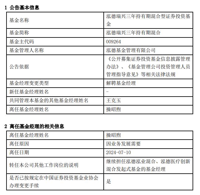 中国经济网北京7月10日讯 泓德基金管理有限公司今日公告称,因业务发展需要,基金经理操昭煦离任泓德瑞兴三年持有期混合。