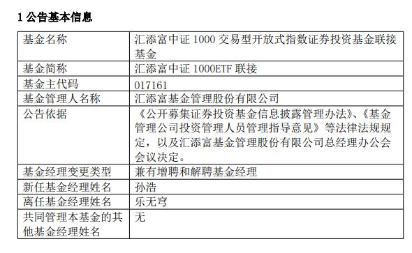 汇添富中证1000ETF联接增聘基金经理孙浩 乐无穹离任