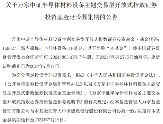 公告称,万家中证半导体材料设备主题交易型开放式指数证券投资基金(基金代码:159327,简称:万家中证半导体材料设备主题ETF)于2024年6月27日开始募集,原定认购截止日为2024年7月11日,现决定将该基金募集期延长至2024年7月19日。