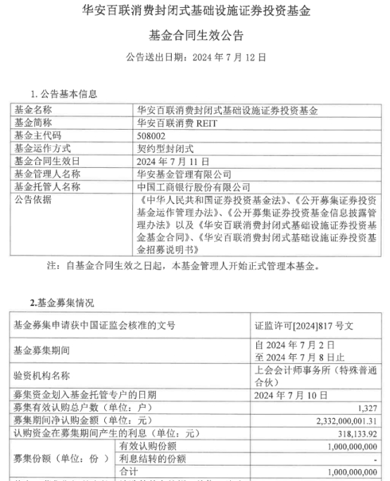 公告称,华安百联消费封闭式基础设施证券投资基金(简称:华安百联消费REIT)募集期间净认购金额2,332,000,001.31元,认购资金在募集期间产生的利息318,133.92元,募集份额合计1,000,000,000份。