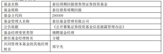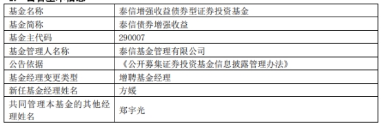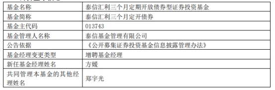 中国经济网北京7月12日讯 今日,泰信基金管理有限公司公告称,泰信债券增强收益、泰信汇利三个月定开债券、泰信债券周期回报增聘基金经理方媛。