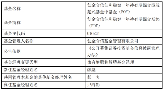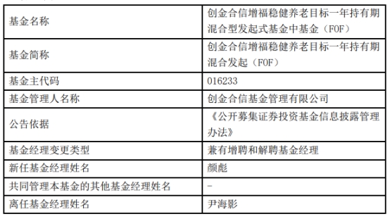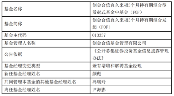 其中,创金合信增福稳健养老目标一年持有期混合发起(FOF)、创金合信佳和稳健一年持有期混合发起(FOF)、创金合信宜久来福3个月持有期混合发起(FOF)增聘基金经理颜彪。颜彪2008年6月加入世纪证券有限公司,历任研究所分析师、总裁办公室总裁秘书、资产管理部投资主办人,2016年8月加入财通证券股份有限公司,任投资银行部高级副总监,2017年2月加入信达澳银基金管理有限管理公司,任专户权益投资部投资经理,2020年9月加入创金合信基金管理有限公司,曾任投资经理、基金经理助理,现任基金经理。