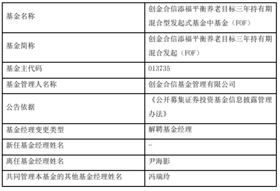 中国经济网北京7月12日讯 今日,创金合信基金管理有限公司公告称,尹海影离任创金合信增福稳健养老目标一年持有期混合发起(FOF)、创金合信佳和稳健一年持有期混合发起(FOF)、创金合信宜久来福3个月持有期混合发起(FOF)、创金合信添福平衡养老目标三年持有期混合发起(FOF)。