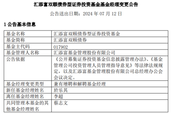 汇添富双颐债券增聘基金经理於乐其 李超离任