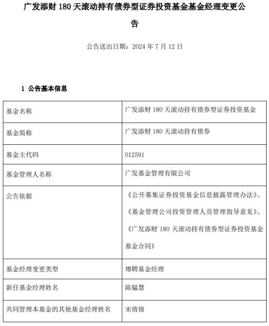 广发添财180天滚动持有债券增聘基金经理陈韫慧