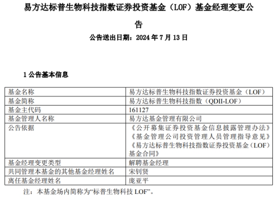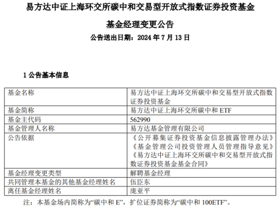 中国经济网北京7月15日讯 近日,易方达基金管理有限公司公告称,庞亚平离任易方达标普生物科技指数(QDII-LOF)、易方达中证上海环交所碳中和ETF。