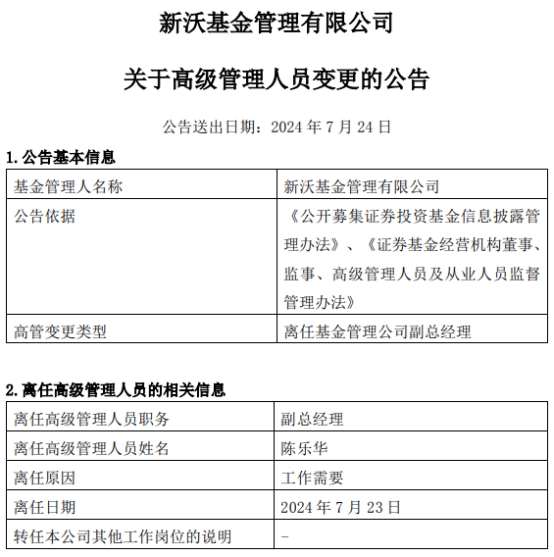 中国经济网北京7月24日讯 今日,新沃基金管理有限公司发布关于高级管理人员变更的公告。公告称,公司副总经理陈乐华因工作需要于2024年7月23日离任。
