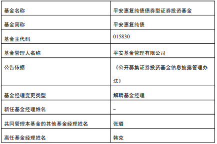 韩克离任平安惠复纯债基金 张璐管理