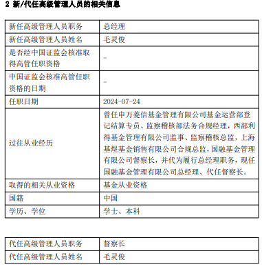 公告显示,毛灵俊曾任申万菱信基金管理有限公司基金运营部登记结算专员、监察稽核部法务合规经理,西部利得基金管理有限公司监事、监察稽核总监,上海基煜基金销售有限公司合规总监,国融基金管理有限公司督察长,并代为履行总经理职务,现任国融基金管理有限公司总经理、代任督察长。