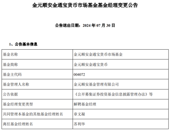 苏利华离任金元顺安金通宝货币