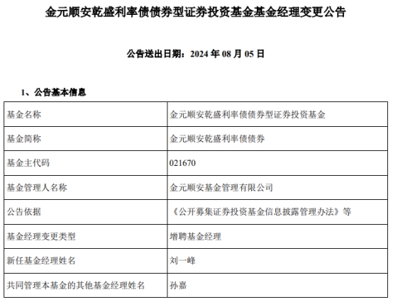 金元顺安乾盛利率债债券增聘基金经理刘一峰