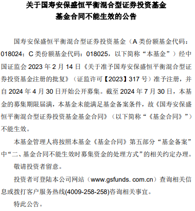 中国经济网北京8月5日讯 近日,国寿安保基金发布国寿安保盛恒平衡混合型证券投资基金基金合同不能生效的公告。公告称,国寿安保盛恒平衡混合型证券投资基金(A 类份额基金代码:018024;C 类份额基金代码:018025)自2024年4月30日开始公开募集。截至2024年7月30日,未能满足基金备案条件,故《国寿安保盛恒平衡混合型证券投资基金基金合同》(以下简称“《基金合同》”)不能生效。