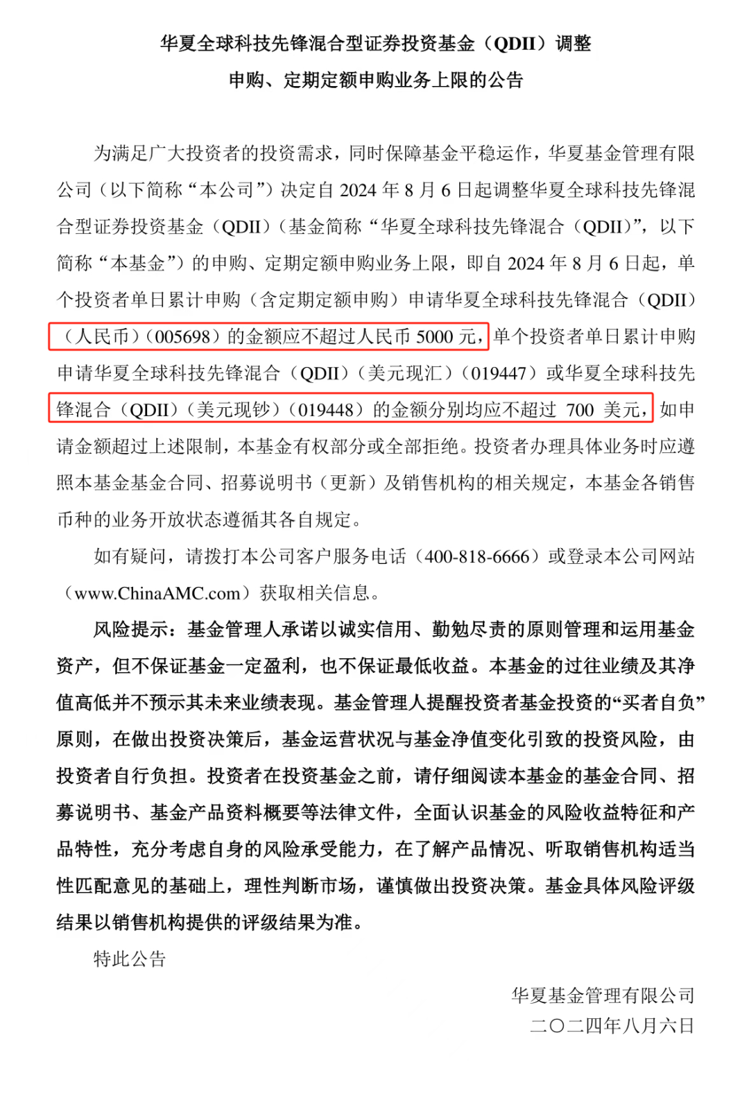 8月6日,华夏全球科技先锋QDII基金公告,即日起将人民币份额的大额申购上限从1000元放宽至5000元,美元份额的申购上限也同步从140美元提升至700美元。