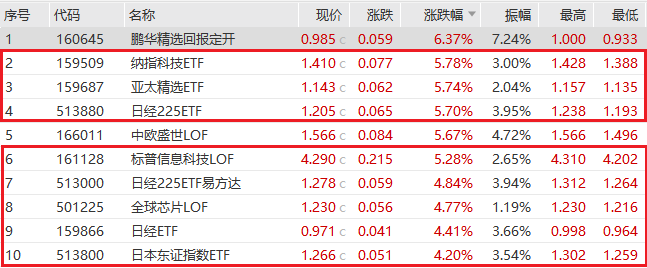 数据显示,8月6日,多只跟踪美国、亚太及日本股市的QDII基金大涨,其中,景顺长城纳指科技ETF大涨5.78%,南方基金南方东英银河联昌富时亚太低碳精选ETF、华安日经225ETF也分别上涨5.74%、5.70%。易方达日经225ETF、工银日经ETF、南方东证指数ETF、博时中证全球中国教育ETF也均录得4%以上的涨幅。