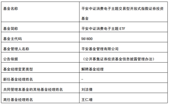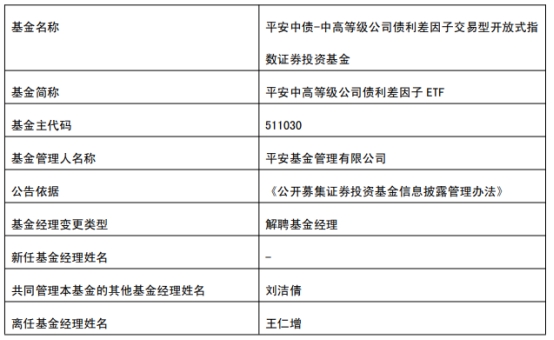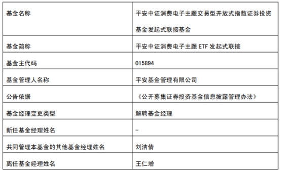 中国经济网北京8月13日讯 今日,平安基金管理有限公司公告称,王仁增离任平安中证沪深港黄金产业ETF、平安中债-0-3年国开行债券ETF、平安中证汽车零部件主题ETF、平安恒生中国企业ETF、平安中高等级公司债利差因子ETF、平安5-10年期国债活跃券ETF、平安中证新能源汽车产业ETF、平安中证消费电子主题ETF、平安中证消费电子主题ETF发起式联接。