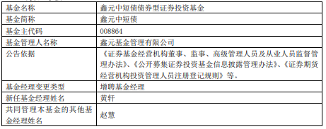 中国经济网北京8月13日讯 今日,鑫元基金管理有限公司公告,鑫元中短债增聘基金经理黄轩。