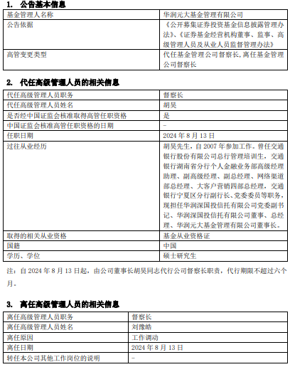 中国经济网北京8月14日讯 今日,华润元大基金管理有限公司发布基金行业高级管理人员变更公告,督察长刘豫皓离任,董事长胡昊代任督察长。