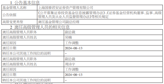 上海国泰君安证券资管副总裁吴楠与周诗宇离任