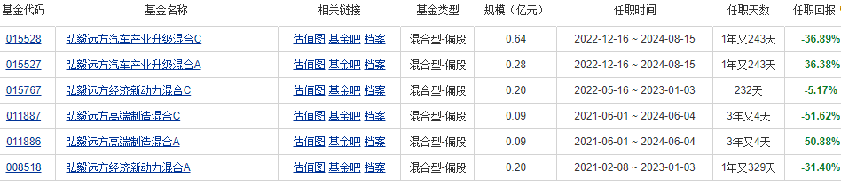 根据天天基金网数据显示,弘毅远方汽车产业升级混合成立于2022年12月16日,截至2024年8月15日,该基金A/C份额不仅在今年内分别下跌19.70%、19.94%,而且自成立以来的累计收益率更是下跌了36.38%和36.89%,累计净值为0.6362元、0.6311元。