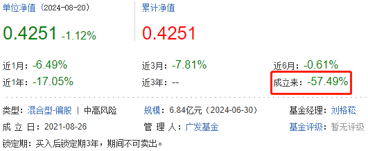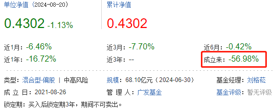 数据显示,广发行业严选三年持有期混合A、C成立于2021年8月26日,买入后锁定期3年,期间不可卖出。据基金二季报显示,截至2024年6月30日,基金份额总额为166.38亿份。截至2024年8月20日,广发行业严选三年持有期混合A、C成立来收益率分别为-56.98%、-57.49%,累计净值分别为0.4302元、0.4251元。