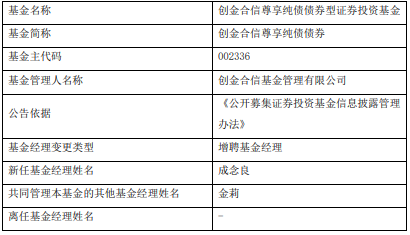 中国经济网北京8月22日讯 今日,创金合信基金管理有限公司公告,创金合信尊享纯债债券增聘基金经理成念良。