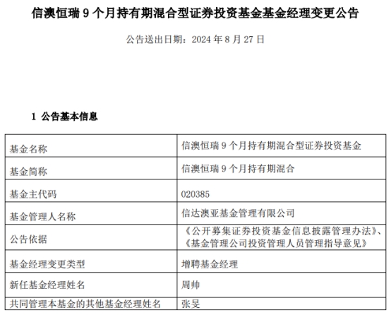 中国经济网北京8月27日讯 今日,信达澳亚基金管理有限公司公告称,信澳恒瑞9个月持有期混合(A类020385;C类020386)增聘基金经理周帅。该基金于2024年8月23日成立。