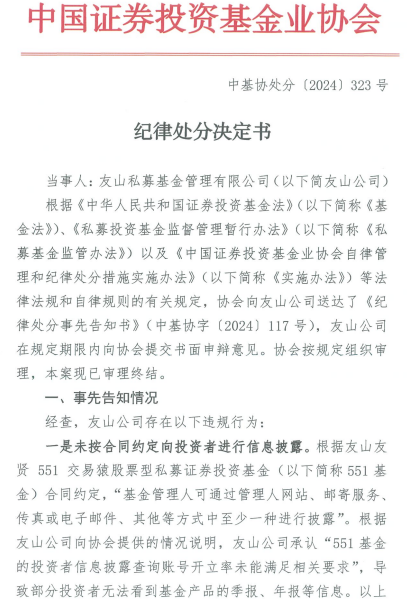 中国经济网北京8月27日讯 近日,中国证券投资基金业协会对友山私募基金管理有限公司(以下简称友山私募)发布纪律处分决定书。
