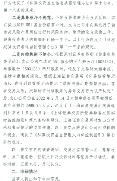 三是内控机制不健全。友山公司在通过551基金购买九安医疗(002432.SZ)、翠微股份(603123.SH)两只股票时,违反了交易所大额申报、连续申报相关规定。在收到监管提示函提示“翠微股份近期频繁异动,存在交易风险,交易所将对该股票的异常交易行为从严认定”后,公司仍在2022年2月14日大额申报交易翠微股份,成交金额约2999.75万元,上海证券交易所对友山公司采取书面警示的监管措施,以上事实反映公司内控机制不健全。