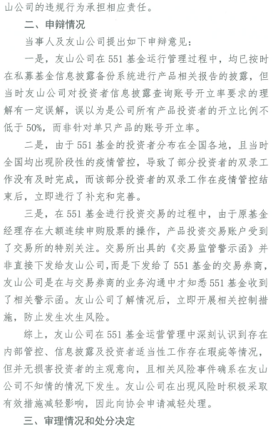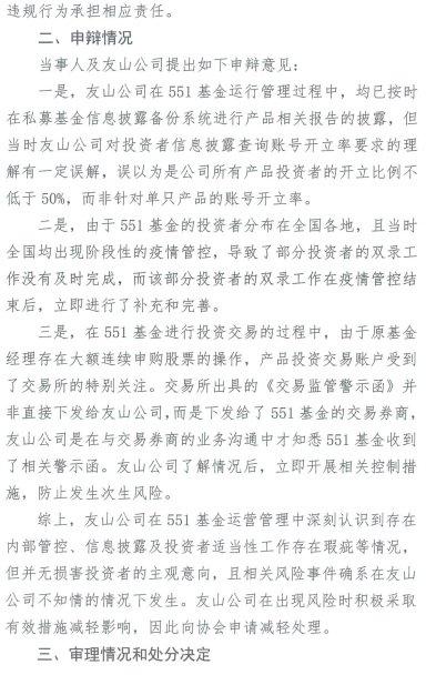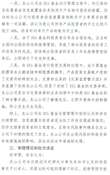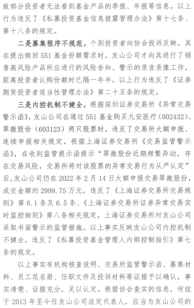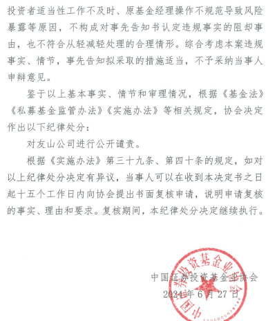 上述情形违反了《私募投资基金信息披露管理办法》第十七条、第十八条,《证券期货投资者适当性管理办法》第二十五条,基于以上事实,协会决定对友山私募进行公开谴责。