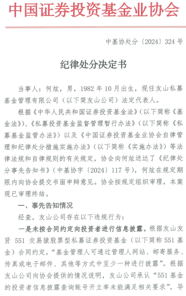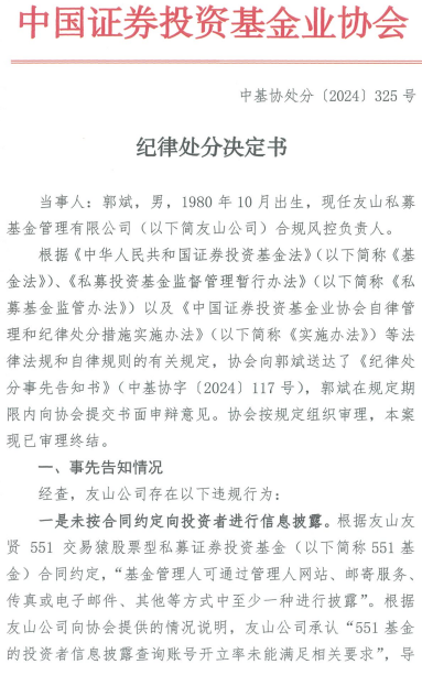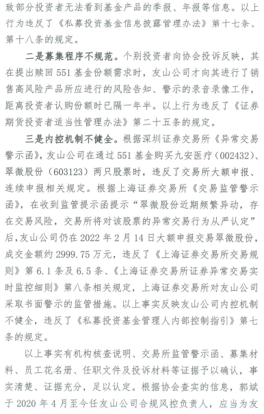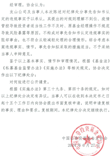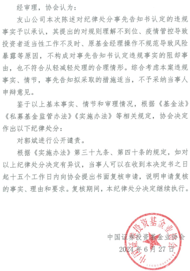 此外,郭斌作为现任友山私募合规风控负责人、何炫作为现任友山私募法定代表人,协会决定对二人进行公开谴责。