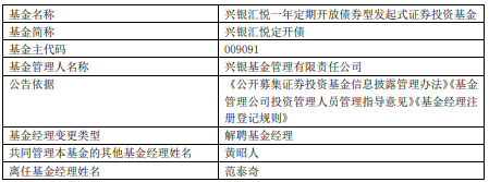 范泰奇离任兴银汇悦定开债 黄昭人管理