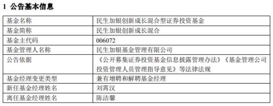 中国经济网北京8月28日讯 今日,民生加银基金管理有限公司公告称,民生加银创新成长混合(A类006072;C类)增聘基金经理刘霄汉,陈洁馨离任。